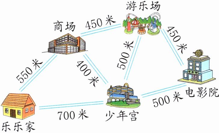 描乐乐家→商场→游乐场这条路550+450=1000(米) 1000 米=1千米