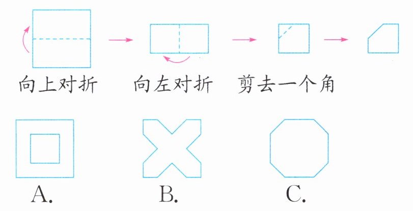 5. (推理意识)美术课上乐乐将一张正方形纸按下面的方法对折两次,然后剪去一个角,展开后得到的图形是(