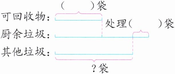 1. (徐州睢宁)垃圾分类管理能够减少垃圾处理量,实现垃圾资源利用。某垃圾回收中转站今天回收了 35 袋可回收物,厨余垃圾的袋数是可回收物的2 倍,厨余垃圾处理掉 12 袋之后就和其他垃圾一样多。这个垃圾回收中转站今天回收了多少袋其他垃圾?(先补齐线段图,再列式解答)