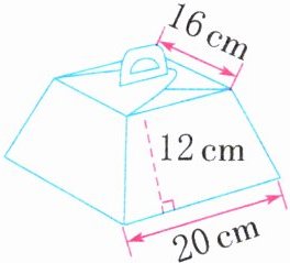 (16 + 20)×12÷2 = 216(cm²) 这个包装盒前、后、左、右每个面的面积都是216cm²