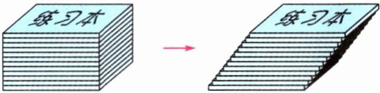 (1) 如图, 先把一些练习本摞成一个长方体, 再把这摞练习本均匀地斜放, 比较从正面看到的两个图形, (