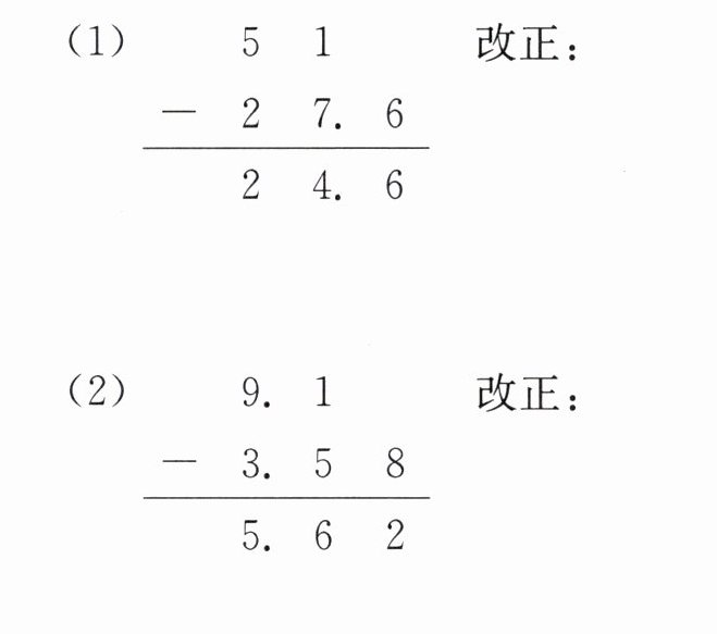 (1)将十分位上错算成了6-0 23.4 竖式略 (2)十分位上的数字相减时,没有减去退位的1 5.52 竖式略