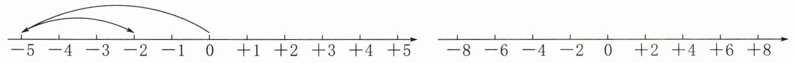 桃桃为了研究正数与负数的加法,做了如下数学实验:把笔尖先放在"0"位置上,然后沿直线向左移动5个单位长度,再向右移动3个单位长度,这时笔尖停在"-2"位置(如左下图)算式可以将以上过及结表示为(-5)+(+)。