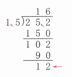 $\begin{array}{r} 16\\ 1.5\enclose{longdiv} {25.2}\\ 150\\ \hline 102\\ 90\\ \hline 12\end{array} $