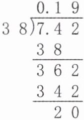 6. (泰州姜堰区)计算:$7.42÷38$(得数保留两位小数)。军军说:“我除到百分位,看到余数是20(如图),就直接写出了答案$7.42÷38≈0.20$。”你觉得军军说得对吗?请说明理由。(不需要继续除下去)