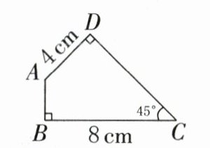 24 解析:如图,延长BA、CD交于点E,则易知三角形BCE和三角形ADE都是等腰直角三角形。由图可知,四边形ABCD的面积=直角边是8cm的等腰直角三角形的面积-直角边是4cm的等腰直角三角形的面积。