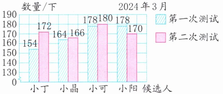 (1)小丁 (2)小丁:(154+172)÷2=163(下) 小晶:(164+166)÷2=165(下) 小可:(178+180)÷2=179(下) 小阳:(178+170)÷2=174(下) (3)小可和小阳 因为小可和小阳两人两次测试的成绩均比较高(合理即可)