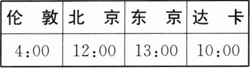 5. 右面是四个城市在12月同一时刻的时间表,以北京时间为标准,东京时间早1小时,记作+1时,则达卡时间记作(