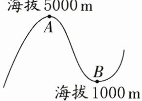 8. 在一定范围内,海拔每升高1km,气温大约下降$6^{\circ}\text{C}$。如图,点A处的海拔5000m气温是$-18^{\circ}\text{C}$,则点B处的气温大约是(