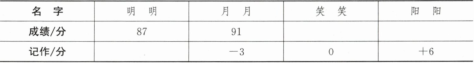 7. 一次歌唱比赛,王老师将几名同学的成绩记录如下,先填表,再填空。