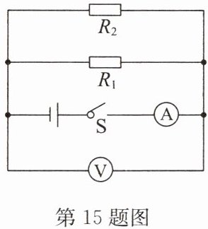15. 在如图所示的电路中, $ R_{1} $、$ R_{2} $ 是定值电阻,其中 $ R_{1} = 40Ω $. 开关闭合后,电流表的示数为 0.45A,电压表的示数为 6V. 求: