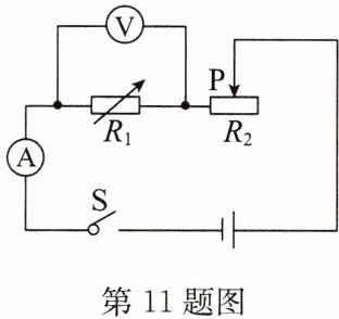11. 用如图所示的电路探究通过导体的电流与电压、电阻的关系. 保持电源电压和电阻箱$R_{1}$的阻值不变,移动滑动变阻器$R_{2}$的滑片 P,测得电流、电压如表 1 所示;然后将滑片移到适当位置保持不变,仅改变电阻箱$R_{1}$的阻值,测得相应的电流值,如表 2 所示.