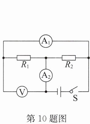 10. 如图所示,$R_{1}= 2Ω$.某同学在实验中记录了三只电表的示数,但没有记录单位,记下的一组数据是 1、2 和 3,也弄不清楚这些数字是哪只电表的示数,单位是 V 还是 A.请根据电路图和记录的数据,确定实验中所用的电源电压和电阻$R_{2}$的阻值分别是(