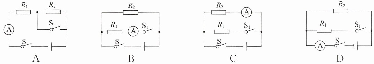 11. 下列各电路中,电源电压不变.先闭合开关 S,再闭合开关$S_{1}$,电流表示数不变的是(