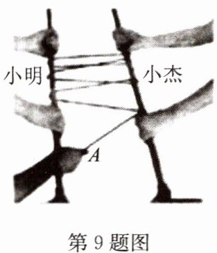 9. 小明和小杰握住两根光滑的木棍,小华将绳子的一端系在其中一根木棍上,然后按如图所示依次将绳子绕过两根木棍,小明和小杰相距一定的距离握紧木棍站稳后,小华在图中A处拉绳子的另一端,用很小的力便能拉动他们手中的木棍.两根木棍和绳子组成的机械相当于