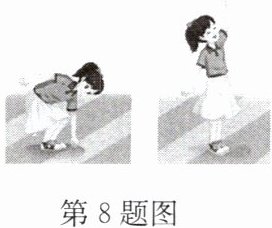 8. 如图所示,九年级女生丹丹从地上拿起一个鸡蛋,用了大约$2s$的时间将它匀速举过头顶,在这$2s$时间内,估算丹丹对鸡蛋做的功和功率分别为(