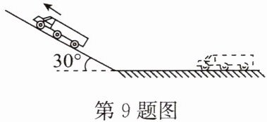 9. 如图所示,重为 $ 3.2 × 10^4N $ 的卡车,经过一段水平路面,再以 $ 9.6 × 10^4W $ 的功率匀速爬上高 5m、长 10m 的斜坡,已知斜坡的机械效率为 80%.求: