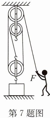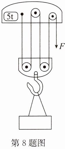 8. (2024·苏州)某起重机的滑轮组结构示意如图所示,其最大载重为 5t.起重机将 3600kg 的钢板匀速提升到 10m 高的桥墩上,滑轮组的机械效率为 80%.不计钢丝绳的重力和摩擦,g 取 10N/kg.求: