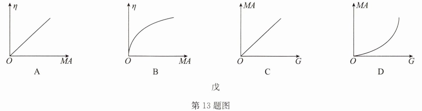 J.(g取10N/kg,不计绳重)(5)物理学中把机械对重物施加的力与人对机械施加的力的比值叫作机械效益MA,用于比较不同机械的省力程度.现用图甲所示滑轮组匀速提升重物,不计绳重和摩擦.则下列描述滑轮组的机械效率η与机械效益MA、机械效益MA与物体重力G的关系图线中,可能正确的是