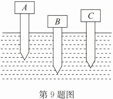 9. 在“探究物体的重力势能与哪些因素有关”的实验中,三个相同的木桩被从空中由静止释放的铁块撞击后,陷入沙坑中的情况如图所示,在此实验中,我们是通过