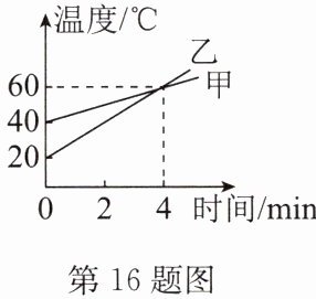 16. 甲、乙两物体的质量之比为$4:1$,用两个相同的酒精灯分别给它们加热(酒精燃烧放出的热量全部被甲和乙吸收),如图所示为甲、乙两物体的温度随时间的变化图像,若甲的比热容为$2.1×10^{3}J/(kg\cdot ^{\circ }C)$,则: