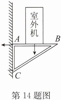 14. 如图所示,用固定在墙上的三角支架ABC放置空调室外机.如果A处螺钉松脱,则支架会绕C点倾翻.已知AB长40cm,AC长30cm.室外机的重力为300N,重心正好处在AB的垂直平分线上.