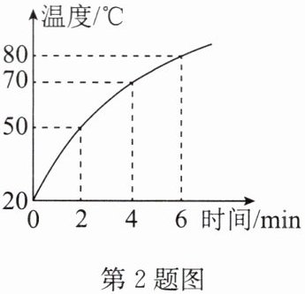 2. 某物理兴趣小组的同学用煤炉给水加热,同时他们绘制了如图所示的加热过程中水温随时间变化的图线,若在6min内完全燃烧了0.2kg的煤,水的比热容为$4.2×10^3J/(kg·℃),$煤的热值约为$3×10^7J/kg。$求: