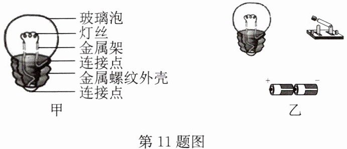 11. 图甲为小灯泡的结构图,请在图乙中连接好实物图,要求闭合开关后小灯泡能发光。