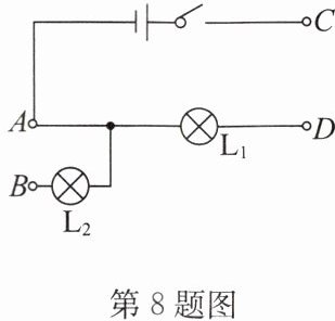 8. 在如图所示的电路中,A、B、C、D是四个接线柱.请用笔画线代替导线连接相应的接线柱,使灯$L_{1}$、$L_{2}$并联,要求:连线横平竖直,规范画出完整电路图.