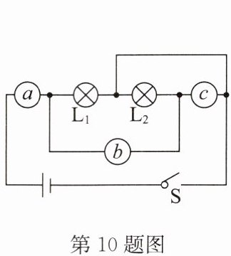 10. 如图所示, 闭合开关 S 后, $ L_{1} $ 和 $ L_{2} $ 两个灯泡并联, a、b、c 三个电表 (可能是电流表或电压表) 的示数依次为 $ 1.5 $、$ 1.0 $、$ 2.0 $ (单位为 V 或 A), 则灯泡 $ L_{1} $ 两端的电压为