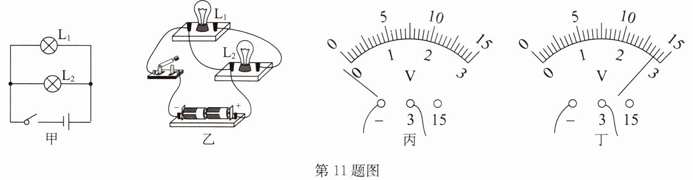 ②重新调整电压表, 正确测出小灯泡 $ L_{1} $ 两端的电压, 电压表的示数如图丁所示, 为
