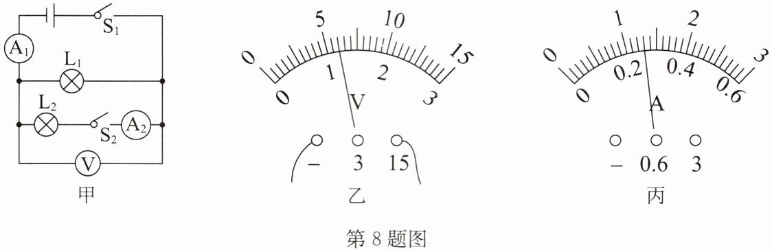 8. 如图甲所示, 仅闭合开关 $ S_{1} $, 电压表的示数如图乙所示; 再闭合开关 $ S_{2} $, 两只电流表的指针位置均如图丙所示.