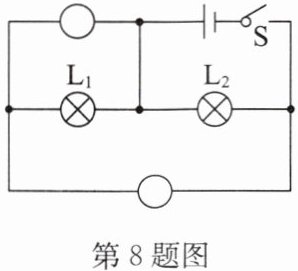 8. 如图所示,试在图中两个“○”内选填“电压表”和“电流表”的符号,使两灯组成并联电路.
