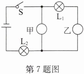 7. 如图所示,闭合开关S后,灯泡$L_{1}$、$L_{2}$都发光,请在圆圈内填上电流表或电压表的符号并标出两电表的“+”“-”接线柱.