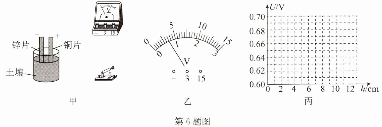 6. 某校研究性学习小组的同学在网上浏览到一条信息:“微生物燃料电池”能利用土壤中的电解质获得电能,供给某种灯发光,受此启发,他们用潮湿的土壤、铜片、锌片等制成了一个“土壤电池”,并测出有一定的电压,如图甲所示. 那么“土壤电池电压的大小与哪些因素有关?”他们提出了以下猜想: