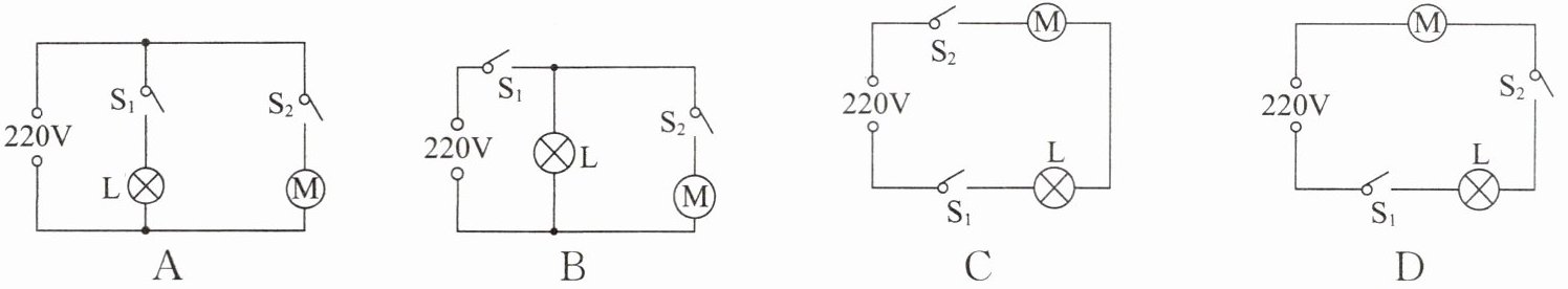 8. (2024·无锡)电冰箱冷藏室中的照明灯 L 由门控开关$S_{1}$控制,压缩机(电动机)由温控开关$S_{2}$控制,要求照明灯和压缩机既能单独工作又能同时工作,下列电路中符合上述特点的是(