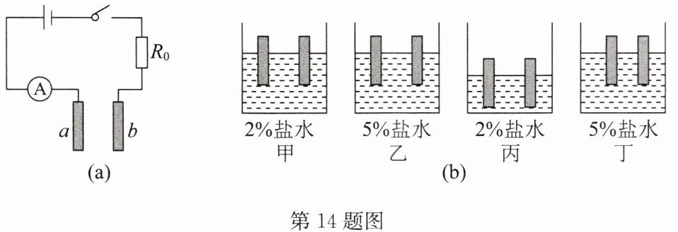 14. 某物理兴趣小组学习了导体电阻的知识后,对食盐水溶液的导电性能与什么因素有关提出了以下猜想: