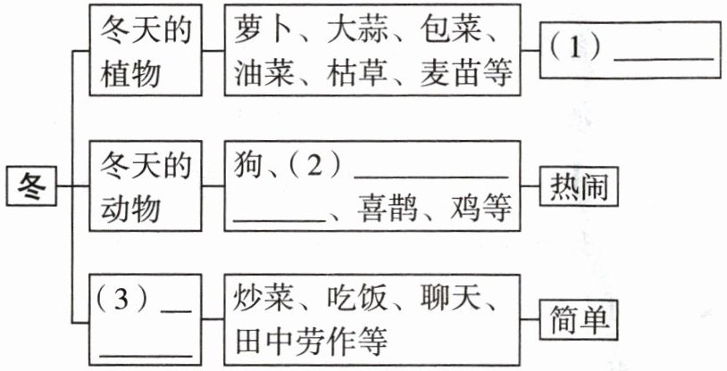 - 冬天的植物$\n$萝卜、大蒜、包菜、油麦菜、油菜、枯草、麦苗等$\n(1) ______- 冬天的动物\n$狗、(2) ______、喜鹊、鸡等$\n热闹- (3) ______\n$炒菜、吃饭、聊天、田中劳作等$\n$简单