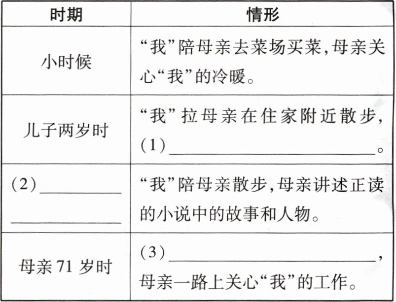 1 仿照示例,梳理"我"陪母亲散步时难忘的情形,填写下表。(3 分)