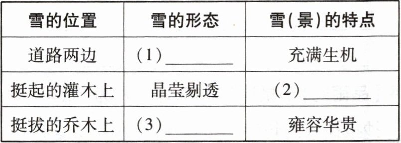 1 秦岭不同地方的雪(景)形态不同,给人的感受也不同,请结合文章第⑤~⑦段,完成下面的表格。(3 分)