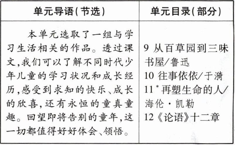 |本单元选取了一组与学习生活相关的作品。透过课文,我们可以了解不同时代少年儿童的学习状况和成长经历,感受到求知的快乐、成长的欣喜,还有永恒的童真童趣。回望即将告别的童年,这一切都值得好好体会、领悟。|9 从百草园到三味书屋/鲁迅10 往事依依/于漪11 *再塑生命的人/海伦·凯勒12《论语》十二章|______