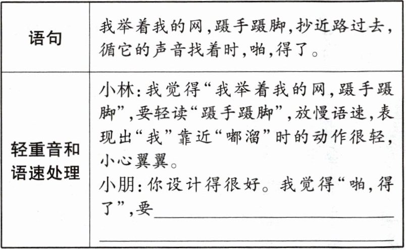 |轻重音和语速处理|小林:我觉得“我举着我的网,蹑手蹑脚”,要轻读“蹑手蹑脚”,放慢语速,表现出“我”靠近“嘟溜”时的动作很轻,小心翼翼。小朋:你设计得很好。我觉得“啪,得了”,要______|