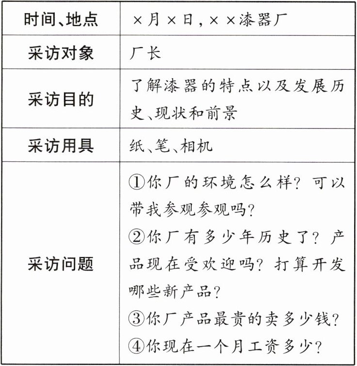 (2)①称呼不得体,可将"你厂"改为"贵厂"。②应删去第③和第④两个与采访目的无关的问题。③应增加关于漆器起源、制作工艺等方面的问题。④应增加有关漆器发展现状、发展前景以及漆器厂发展规划等方面的问题。