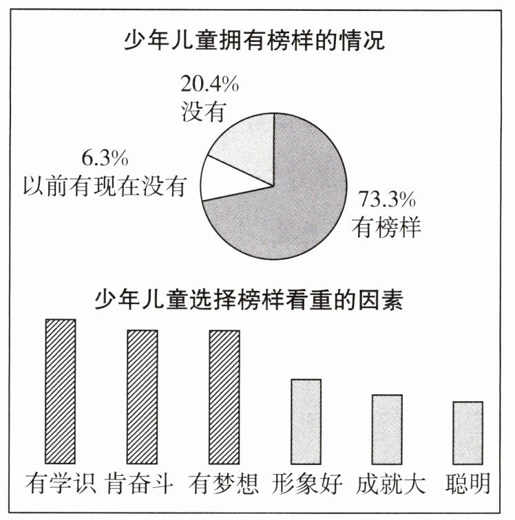 (1)示例:七成以上的少年儿童拥有榜样;他们最看重的因素是有学识、肯奋斗、有梦想;他们选择榜样时受父母和亲人、老师的影响较大。