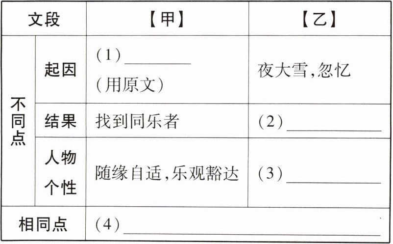 8 甲、乙两段文字告诉我们苏轼与王子猷都曾夜找好友,请你借助下面表格比较这两段文字的异同点。(4分)
