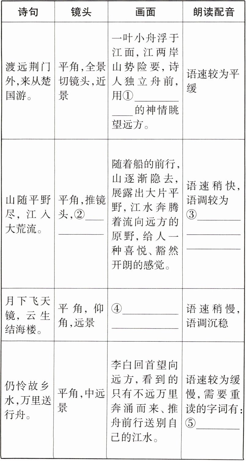 2 新课标·情境化设问 学校准备根据《渡荆门送别》拍一部关于李白“仗剑去国,辞亲远游”的主题纪录片。学校邀请同学们一起来完成拍摄脚本,请你参与完成下表。(6 分)