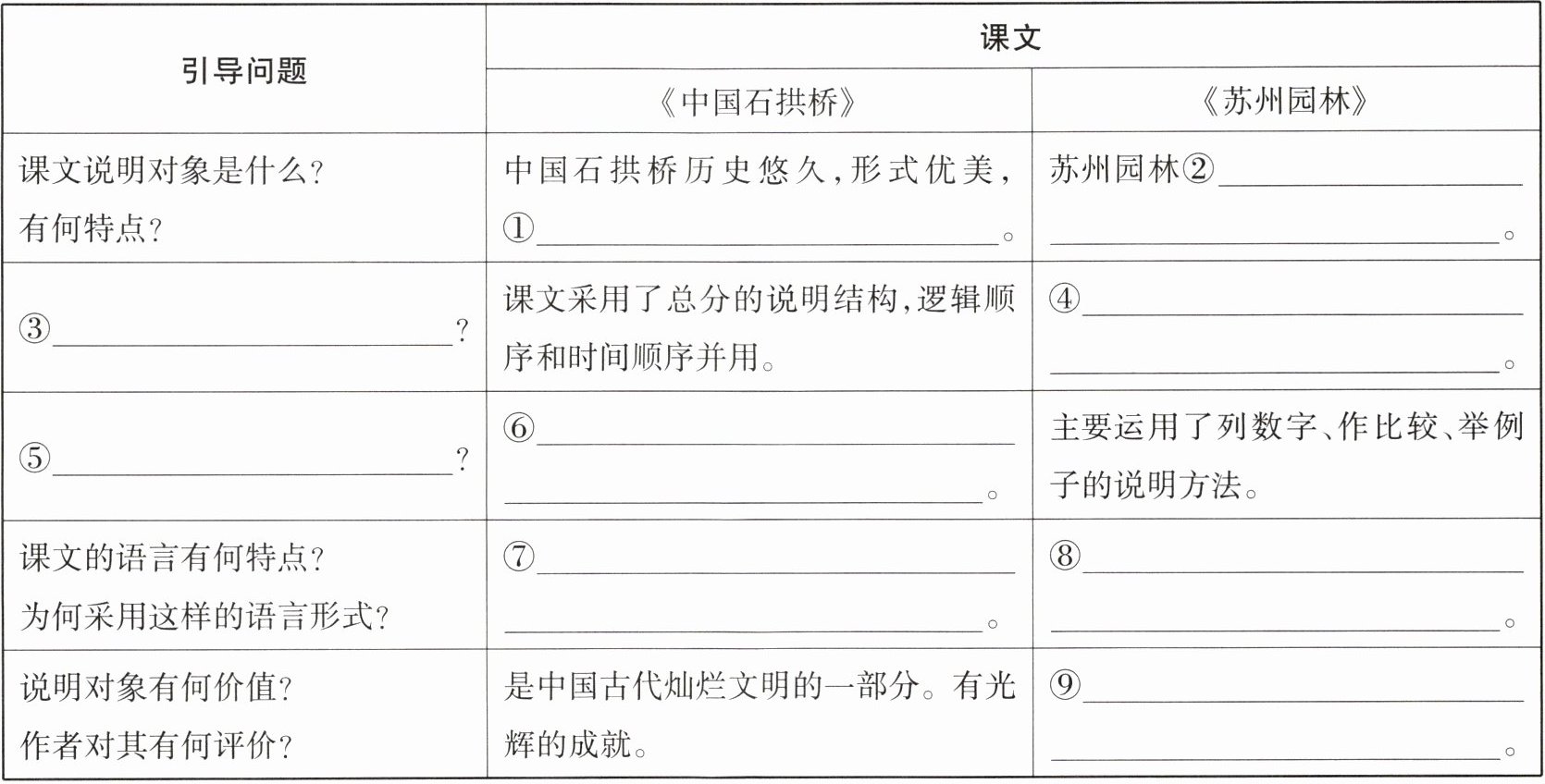 1 学习事物说明文,我们要掌握说明事物的方法,请以《中国石拱桥》《苏州园林》为例,完成下面的表格。