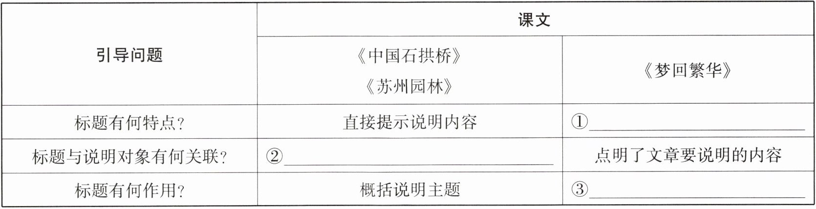 2 本单元课文都属于事物说明文。有些课文直接使用“说明对象”作为标题,而《梦回繁华》一课的标题却“标新立异”。请根据表格提示,体会这两类标题的不同效果。