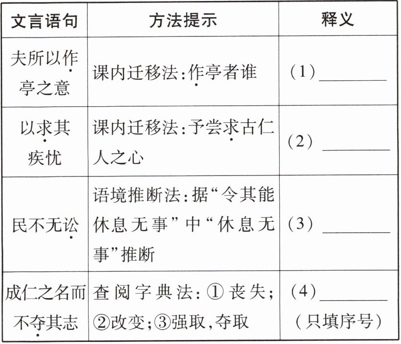 古仁人之心|(2)||民不无讼|语境推断法:据“令其能休息无事”中“休息无事”推断|(3)|