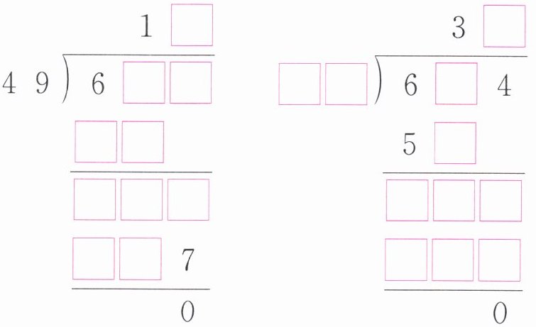 或 解析:第1个竖式,根据9的乘法口诀,可知商的个位上是3,然后根据竖式的运算顺序,接着填空即可。第2个竖式答案不唯一,由商的十位上是3及第三行的数字5,可知除数可能是17、18或19,因为商的个位上的数字与除数的积是三位数,且个位上是4,所以排除除数是17的可能,即除数是18或19,然后根据竖式的运算顺序,接着填空即可。